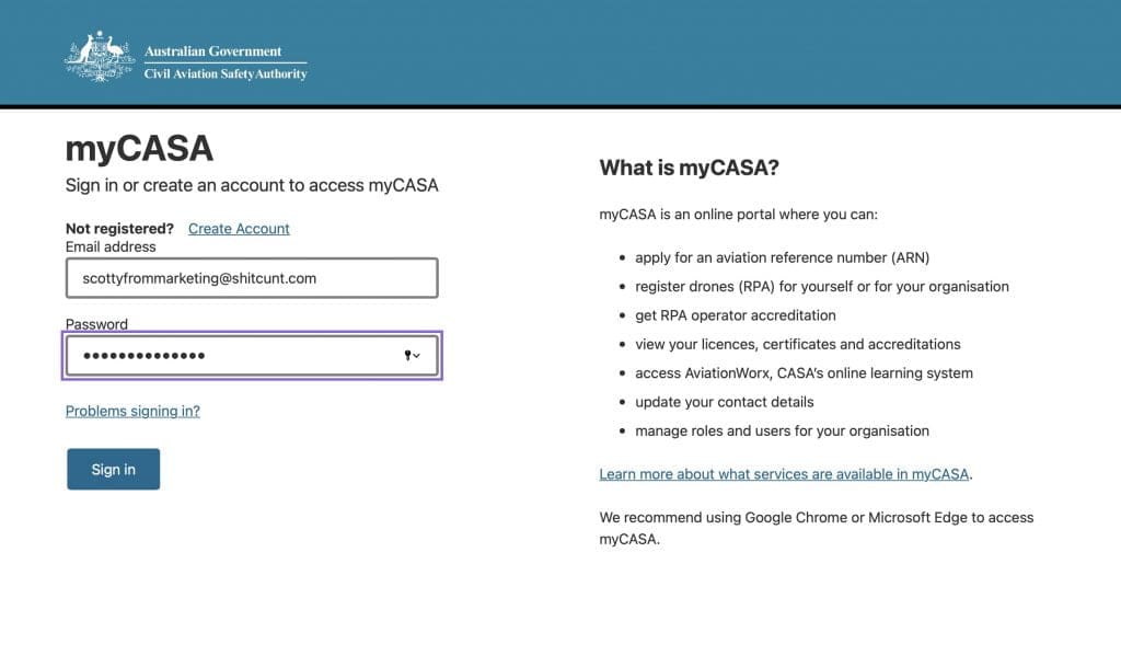 Okay firstly need to create your MyCASA account - this is not the accreditation bit - just a login so you can manage all this official paperwork. Think of it as MyGov for your drone and you won't be too wide of the mark. Anyway - create a log-in, confirm your email address and then log-in.