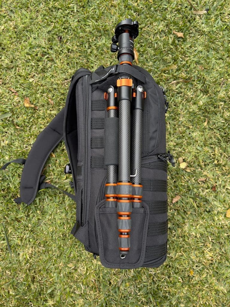 In addition to the main bag LowePro also bundle various add-ons with the pack which include a tripod holder, a water bottle holder, an accessory bag and a large detachable waist strap. The add-ons can be fixed virtually anywhere on the pack using velcro loops giving a great deal of flexibility in arranging the exterior of the pack. The only one I'm using at the moment is the tripod holder which I've mounted on the side of the pack along with my awesome new lightweight K&F BA225 carbon fibre tripod. The bag also includes a rain cover which is permanently secured and tucked away in a little pouch on the base and is the AW (all weather) bit in the pack's name.